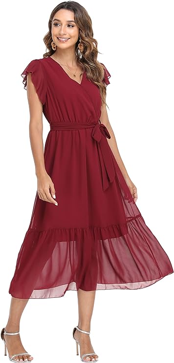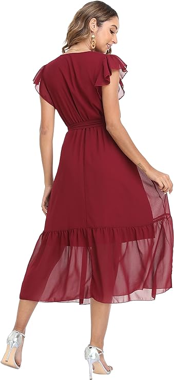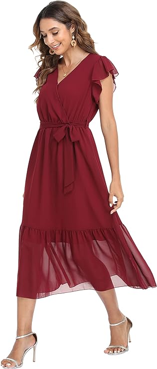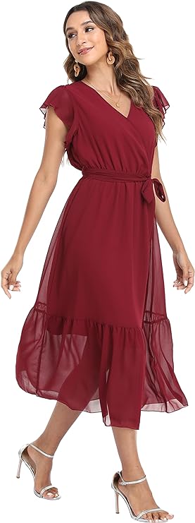- Festures: Ruffle short sleeve, Deep V neck end with a Safety Button, floral printed, A line, removable belt, midi length, flowy and lightweight, lined Midi Dress